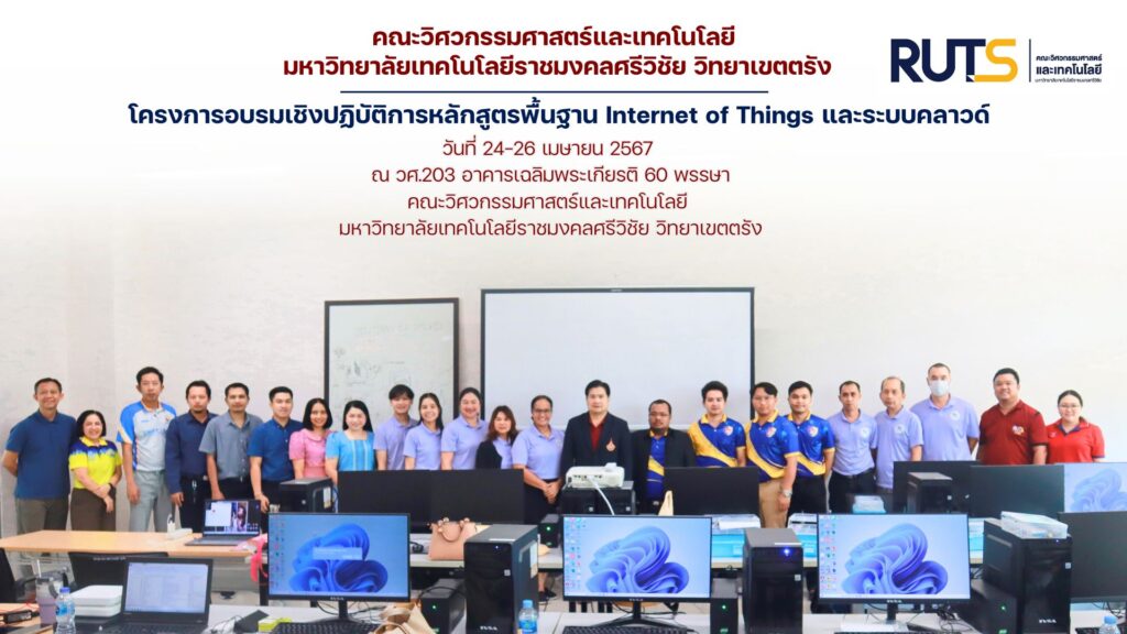 วันที่ 24 เมษายน 2567 คณะวิศวกรรมศาสตร์และเทคโนโลยี มทร … อ่านเพิ่มเติม คณะวิศวกรรมศาสตร์และเทคโนโลยี มหาวิทยาลัยเทคโนโลยีราชมงคลศรีวิชัย วิทยาเขตตรัง จัดโครงการอบรมเชิงปฏิบัติการหลักสูตรพื้นฐาน Internet of Things และระบบคลาวด์