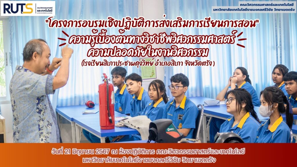 วันที่ 21 มิถุนายน 2567 คณะวิศวกรรมศาสตร์และเทคโนโลยี มหาวิทยาลัยเทคโนโลยีราชมงคลศรีวิชัย วิทยาเขตตรัง จัดโครงการอบรมเชิงปฏิบัติการส่งเสริมการเรียนการสอนให้กับนักเรียนชั้นมัธยมศึกษาปีที่ 4 โรงเรียนสิเกาประชาผดุงวิทย์ อำเภอสิเกา จังหวัดตรัง ภายใต้การบันทึกข้อตกลงความร่วมมือ การบริการวิชาการระหว่างมหาวิทยาลัย และ โรงเรียนสิเกาประชาผดุงวิทย์ ในการจัดโครงการอบรมเชิงปฏิบัติการและส่งเสริมการเรียนการสอน “ความรู้เบื้องต้นทางวิชาชีพวิศวกรรมศาสตร์” เพื่อให้นักเรียนชั้นมัธยมศึกษาปีที่ 4 ในแผนการเรียนเตรียมวิศวกรรมศาสตร์ โรงเรียนสิเกาประชาผดุงวิทย์ อำเภอสิเกา จังหวัดตรัง จำนวน 25 คน โดยมีอาจารย์กิตติศักดิ์ ทวีสินโสภา อาจารย์ประจำสาขาเทคโนโลยีวิศวกรรม เป็นวิทยากรบรรยายให้ความรู้ ในหัวข้อ “ความปลอดภัยในงานวิศวกรรม“ จัดขึ้น ณ ห้องปฏิบัติการ วศ.305 อาคารเฉลิมพระเกียรติ 60 พรรษา คณะวิศวกรรมศาสตร์และเทคโนโลยี มหาวิทยาลัยเทคโนโลยีราชมงคลศรีวิชัย วิทยาเขตตรัง เพื่อเป็นการสร้างความรู้ความเข้าใจทักษะด้านความรู้เบื้องต้นของวิศวกรรมศาสตร์ ทั้งภาคทฤษฎีและเชิงปฏิบัติการ ส่งเสริมการเรียนการสอน และนำความรู้ไปพัฒนาศักยภาพต่อยอดทางด้านวิศวกรรม อีกทั้งยังเป็นการเพิ่มแรงบันดาลใจ สร้างความสนใจทางด้านวิศวกรรมในสาขาต่างๆ และรองรับการศึกษาต่อได้อีกด้วย