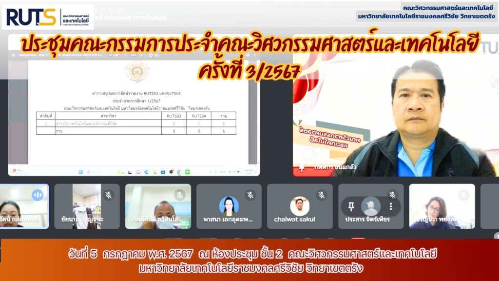 เมื่อวันศุกร์ที่ 5 กรกฎาคม2567 คณะวิศวกรรมศาสตร์และเทคโนโลยี มหาวิทยาลัยเทคโนโลยีราชมงคลศรีวิชัย วิทยาเขตตรัง ประชุมคณะกรรมการประจำคณะวิศวกรรมศาสตร์และเทคโนโลยี ครั้งที่ 3/2567 โดยมีผู้ช่วยศาสตราจารย์กิตติกร ขันแกล้ว คณบดีคณะวิศวกรรมศาสตร์และเทคโนโลยี เป็นประธานในการประชุม พร้อมด้วยคณะกรรมการประจำคณะฯ เข้าร่วมประชุมในการชี้แจงรายละเอียดประเด็นต่าง ๆ ผ่านระบบออนไลน์ google meet