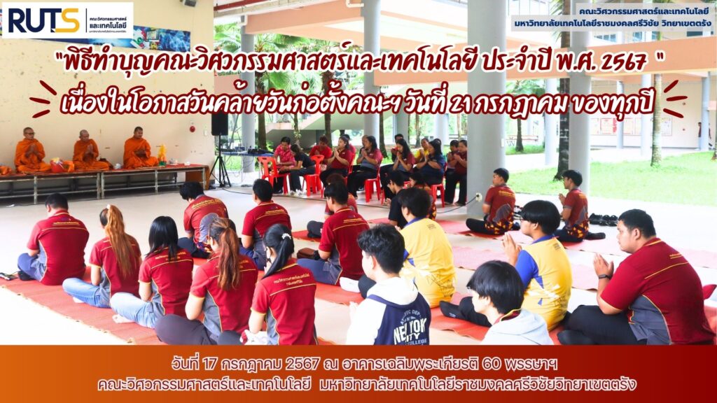 วันที่ 17 กรกฎาคม 2567 ผู้ช่วยศาสตราจารย์กิตติกร ขันแกล้ว คณบดีคณะวิศวกรรมศาสตร์และเทคโนโลยี มหาวิทยาลัยเทคโนโลยีราชมงคลศรีวิชัย วิทยาเขตตรัง เป็นประธานในพิธีจุดธูปเทียนบูชาพระรัตนตรัย และถวายเครื่องสังฆทาน พร้อมเครื่องไทยธรรมแด่พระสงฆ์วัดเขาแก้ว อ.สิเกา จ.ตรัง จำนวน ๕ รูป ในพิธี ทำบุญคณะวิศวกรรมศาสตร์และเทคโนโลยี ประจำปี พ.ศ. 2567 เนื่องในโอกาสวันคล้ายวันก่อตั้งคณะฯ วันที่ 21 กรกฎาคม ของทุกปี โดยมีผู้บริหาร คณาจารย์ บุคลากรและนักศึกษา เข้าร่วมพิธีกรรมทางศาสนา ณ.อาคารเฉลิมพระเกียรติ 60 พรรษาฯ คณะวิศวกรรมศาสตร์และเทคโนโลยี มหาวิทยาลัยเทคโนโลยีราชมงคลศรีวิชัยวิทยาเขตตรัง