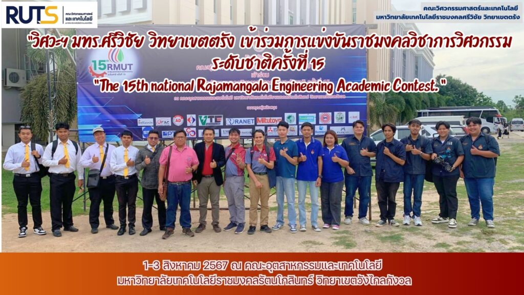 เมื่อวันที่ 1 สิงหาคม 2567 นำโดย ผศ.ดร.ดร.ปภัศร์ชกรณ์ อารีย์กุล อาจารย์ประจำสาขาวิศวกรรม นำทีมนักศึกษา อาจารย์ผู้คุมทีม บุคลากร คณะวิศวกรรมศาสตร์และเทคโนโลยี ร่วมแข่งขันทักษะราชมงคลวิชาการระดับชาติ ครั้งที่15 The 15th national Rajamangala Engineering Academic Contest ซึ่งจัดระหว่าง 1-3 สิงหาคม 2567 ณ คณะอุตสาหกรรมและเทคโนโลยี มหาวิทยาลัยเทคโนโลยีราชมงคลรัตนโกสินทร์ วิทยาเขตวังไกลกังวล