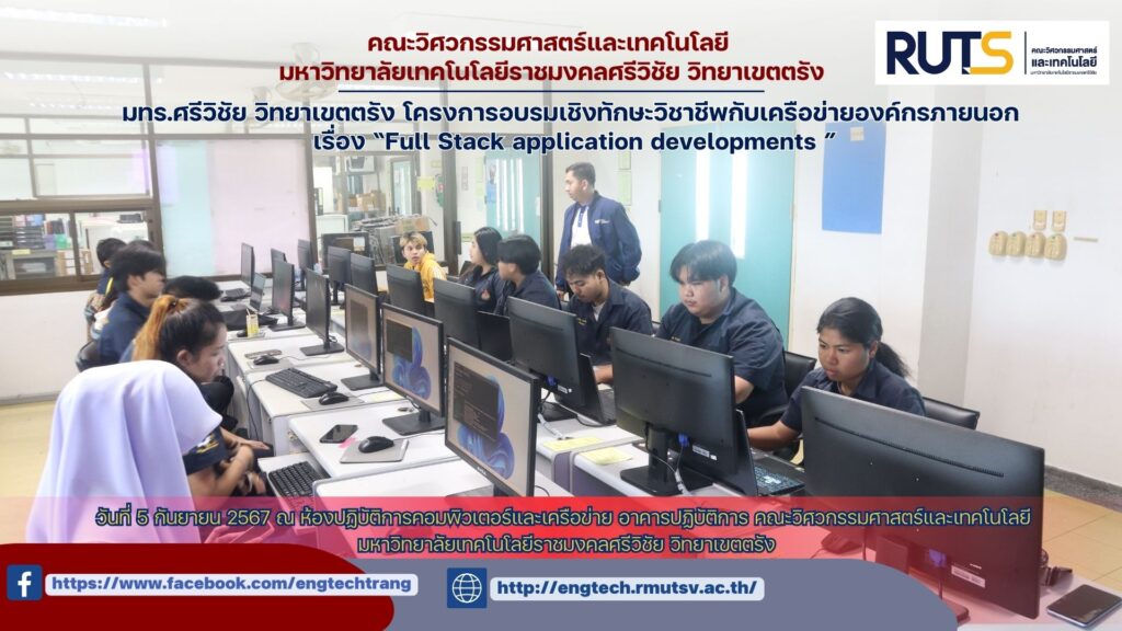 วันที่ 5 กันยายน 2567 คณะวิศวกรรมศาสตร์และเทคโนโลยี มหาวิทยาลัยเทคโนโลยีราชมงคลศรีวิชัย วิทยาเขตตรัง นำโดย อาจารย์สิริรักษ์ ขันฒานุรักษ์ หัวหน้าสาขาเทคโนโลยีวิศวกรรม เป็นประธานกล่าวเปิดโครงการอบรมเชิงทักษะวิชาชีพกับเครือข่ายองค์กรภายนอก เรื่อง “Full Stack application developments” ให้กับนักศึกษาสาขาวิชาเทคโนโลยีคอมพิวเตอร์ จำนวน 30 คน ระหว่างวันที่ 4-6 กันยายน 2567 ณ ห้องปฏิบัติการคอมพิวเตอร์และเครือข่าย อาคารปฏิบัติการ คณะวิศวกรรมศาสตร์และเทคโนโลยี มหาวิทยาลัยเทคโนโลยีราชมงคลศรีวิชัย วิทยาเขตตรัง โครงการฯ ดังกล่าว ได้รับเกียรติจาก นายอนุวัฒน์ พัฒนเชียร นักวิชาการคอมพิวเตอร์ คณะวิทยาการจัดการ มหาวิทยาลัยสงขลานครินทร์ เป็นวิทยากรบรรยายเรื่อง ” Full-stack Web Developer ” เพื่อให้นักศึกษามีความรู้ ความสามารถทักษะการใช้ภาษา HTML และ CSS สำหรับการสร้างหน้าเว็บด้วยการเขียนโค้ด ซึ่งเป็นส่วนสำคัญสำหรับสายงาน Front-end Web Developer และสำหรับผู้ที่ต้องการสร้าง Web Application ในรูปแบบต่าง ๆ สามารถนำความรู้ไปพัฒนาศักยภาพต่อยอดและมีทางเลือกทำอาชีพอิสระมากขึ้น
