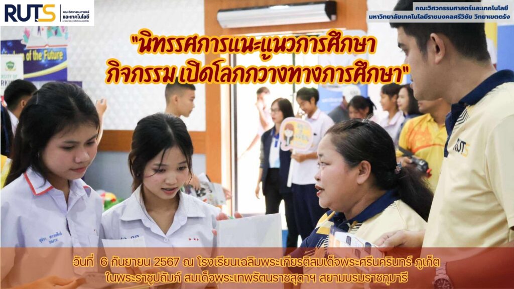 วันที่ 6 กันยายน 2567 นำโดย นางชนิภักดิ์ ครชาตรี นักวิชาการศึกษา คณะวิศวกรรมศาสตร์และเทคโนโลยี มทร.ศรีวิชัย วิทยาเขตตรังและทีมแนะแนวการศึกษา วิทยาเขตตรัง ได้เข้าร่วมจัดนิทรรศการแนะแนวการศึกษา กิจกรรม เปิดโลกกว้างทางการศึกษา ชั้นมัธยมศึกษาปีที่ 3 และชั้นมัธยมศึกษาปีที่ 6 ณ โรงเรียนเฉลิมพระเกียรติสมเด็จพระศรีนครินทร์ ภูเก็ต ในพระราชูปถัมภ์ สมเด็จพระเทพรัตนราชสุดาฯ สยามบรมราชกุมารี เพื่อประชาสัมพันธ์หลักสูตรและการเข้าศึกษาต่อในระดับปริญญาตรี ประจำปีการศึกษา 2568 ของคณะวิศวกรรมศาสตร์และเทคโนโลยี มหาวิทยาลัยเทคโนโลยีราชมงคลศรีวิชัย วิทยาเขตตรัง