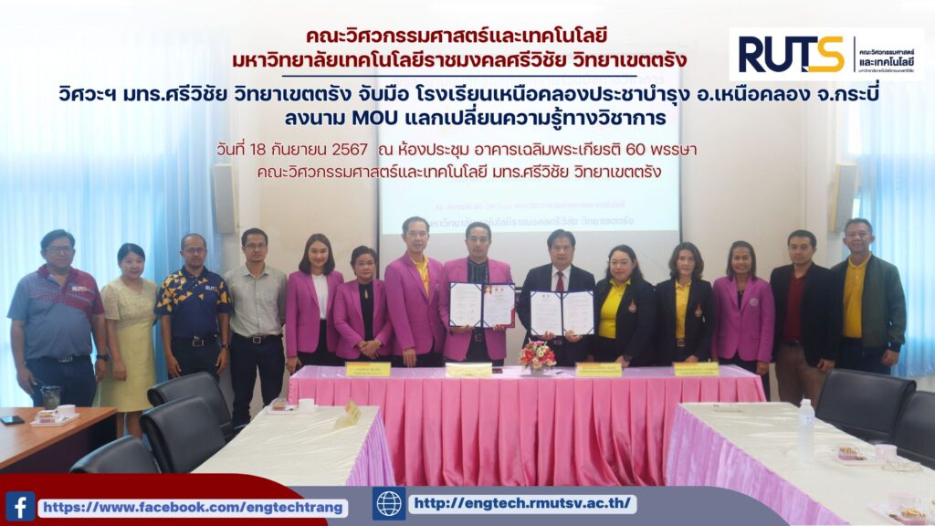 วันที่ 18 กันยายน 2567 คณะวิศวกรรมศาสตร์และเทคโนโลยี มทร.ศรีวิชัย วิทยาเขตตรัง ร่วมพิธีลงนามความร่วมมือทางวิชาการ (MOU) ระหว่าง คณะวิศวกรรมศาสตร์และเทคโนโลยี มทร.ศรีวิชัย วิทยาตรัง กับ โรงเรียนเหนือคลองประชาบำรุง อ.เหนือคลอง จ.กระบี่ โดยมี ผู้ช่วยศาสตราจารย์กิตติกร ขันแกล้ว คณบดีคณะวิศวกรรมศาสตร์และเทคโนโลยี ได้รับมอบอำนาจให้ปฏิบัติราชการแทนอธิการบดีมหาวิทยาลัยเทคโนโลยีราชมงคลศรีวิชัย ร่วมลงนามในบันทึกข้อตกลงความร่วมมือทางวิชาการ กับ นายวันสุนทร ไชยโรจน์ รองผู้อำนวยการกลุ่มบริหารวิชาการ โรงเรียนเหนือคลองประชาบำรุง จังหวัดกระบี่ เพื่อประสานความร่วมมือระหว่างครู อาจารย์ บุคลากร พัฒนาความรู้ทางด้านวิชาการและการถ่ายทอดเทคโนโลยี งานวิจัย การพัฒนานวัตกรรม และสิ่งประดิษฐ์ การถ่ายทอดแลกเปลี่ยนองค์ความรู้ประสบการณ์ร่วมกัน ส่งเสริมความร่วมมือในการจัดประชุม การสัมมนาทางวิชาการ ตลอดจนกิจกรรมทางวิชาการอื่นๆ ให้แก่นักเรียนและนักศึกษา โดยมี ผู้ช่วยศาสตราจารย์พาสนา เอกอุดมพงษ์ รองคณบดีฝ่ายวิชาการและวิจัย อาจารย์ขวัญชีวา หยงสตาร์ รองคณบดีฝ่ายพัฒนานักศึกษา คณะอาจารย์ คณะวิศวกรรมศาสตร์และเทคโนโลยี พร้อมด้วย บุคลากร นักเรียน โรงเรียนเหนือคลองประชาบำรุง จังหวัดกระบี่ ร่วมเป็นสักขีพยาน การลงนามในครั้งนี้จัดขึ้น ณ ห้องประชุม อาคารเฉลิมพระเกียรติ 60 พรรษา คณะวิศวกรรมศาสตร์และเทคโนโลยี มทร.ศรีวิชัย วิทยาเขตตรัง