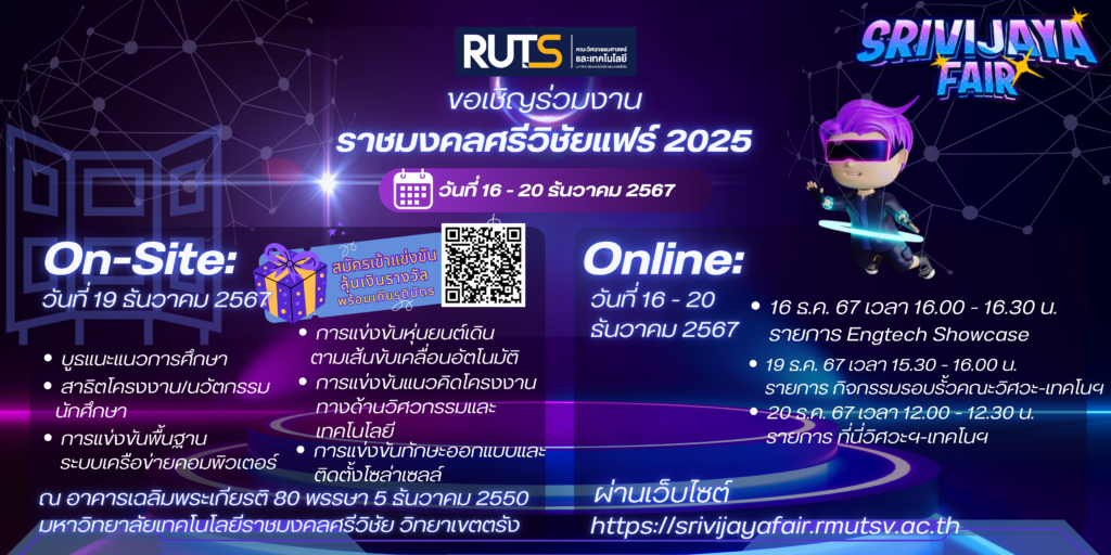 ข่าวประชาสัมพันธ์ วิศวะ มทร.ศรีวิชัย วิทยาเขตตรัง จัดโครงการส่งเสริมและพัฒนานวัตกรรม หรืองานสร้างสรรค์ของนักศึกษาสู่ผู้ประกอบการ20 มีนาคม 202520 มีนาคม 2025