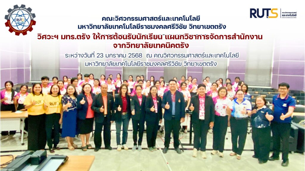 วันที่ 23 มกราคม 2568 ผู้ช่วยศาสตราจารย์นเรศ ขวัญทอง รองคณบดีฝ่ายบริหารและวางแผน พร้อมด้วยคณะผู้บริหาร คณาจารย์และบุคลากร ให้การต้อนรับนักเรียน นักศึกษา แผนกวิชาการจัดการสำนักงาน จากวิทยาลัยเทคนิคตรัง จำนวน 50 คน ในการเข้าเยี่ยมชมและศึกษาดูงานการดำเนินงานโดยการนำระบบเทคโนโลยีสารสนเทศไปประยุกต์ใช้ในองค์กร พร้อมทั้งแลกเปลี่ยนเรียนรู้กระบวนการดำเนินงานต่าง ๆ เพื่อให้นักเรียนมีความรู้เกี่ยวกับการบริหารงานและการจัดองค์กรสมัยใหม่ ณ ห้องประชุม คณวิศวกรรมศาสตร์และเทคโนโลยี มหาวิทยาลัยเทคโนโลยีราชมงคลศรีวิชัย วิทยาเขตตรัง