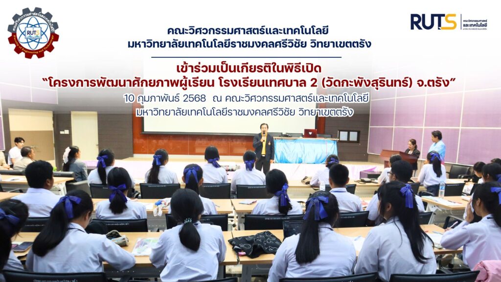 วันจันทร์ ที่ 10 กุมภาพันธ์ 2568 ผู้ช่วยศาสตราจารย์สิทธิโชค จันทร์ย่อง รองอธิการบดีประจำวิทยาเขตตรัง มอบหมายให้ผู้ช่วยศาสตราจารย์กิตติกร ขันแกล้ว คณบดีคณะวิศวกรรมศาสตร์และเทคโนโลยี มทร.ศรีวิชัย วิทยาเขตตรัง พร้อมคณะผู้บริหาร และบุคลากร ร่วมให้การต้อนรับ ผู้บริหารคณะครูและนักเรียนโรงเรียนเทศบาล 2 (วัดกะพังสุรินทร์) จ.ตรัง เพื่อดำเนินโครงการเพื่อส่งเสริมพัฒนาด้านความรู้และทักษะวิชา คณิตศาสตร์ ฟิสิกส์ เคมี ชีวะ สังคมศึกษา ภาษาไทยและภาษาต่างประเทศ โดยมีนายจรวย บุญล้อม ผู้อำนวยการโรงเรียนเทศบาล 2 เป็นประธานในการเปิดโครงการ ภายใต้ความร่วมมือในการพัฒนาทางวิชาการระหว่าง มทร.ศรีวิชัย ศรีวิชัยวิทยาเขตตรัง กับ โรงเรียนเทศบาล 2 (วัดกะพังสุรินทร์) จ. ตรัง ณ ห้องประชุมเทคโนโลยีคณะวิศวกรรมศาสตร์และเทคโนโลยี มทร.ศรีวิชัย วิทยาเขตตรัง