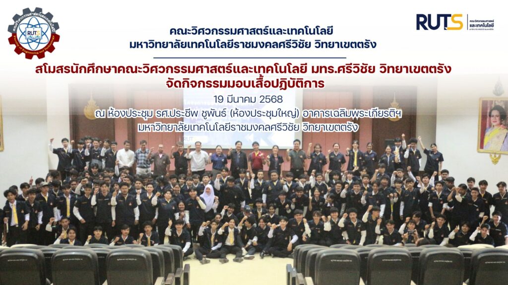 วันที่ 19 มีนาคม 2568 สโมสรนักศึกษาคณะวิศวกรรมศาสตร์และเทคโนโลยี มทร.ศรีวิชัย วิทยาเขตตรัง จัดกิจกรรมมอบเสื้อปฏิบัติการให้กับนักศึกษาชั้นปีที่1 คณะวิศวกรรมศาสตร์และเทคโนโลยี โดยมีผู้ช่วยศาสตราจารย์กิตติกร ขันแกล้ว คณบดีคณะวิศวกรรมศาสตร์และเทคโนโลยี เป็นประธานในพิธี พร้อมด้วยนางสาวขวัญชีวา หยงสตาร์ รองคณบดีฝ่ายพัฒนานักศึกษา และคณาจารย์เป็นผู้มอบเสื้อปฏิบัติการ เพื่อให้นักศึกษาเกิดความภาคภูมิใจในสาขาวิชาชีพของตนเอง ส่งเสริมให้เกิดความเป็นอันหนึ่งอันเดียวกันในหมู่นักศึกษาวิศวกรรมศาสตร์ สร้างจิตสำนึกในความรับผิดชอบ ช่วยให้นักศึกษาตระหนักถึงบทบาทของตนเองในฐานะวิศวกรที่ต้องมีระเบียบและความรับผิดชอบและเป็นสื่อกลางสำหรับแสดงถึงความพร้อมในการเรียนรู้และทำงานทางด้านวิศวะ ณ ห้องประชุม รศ.ประชีพ ชูพันธ์ (ห้องประชุมใหญ่) อาคารเฉลิมพระเกียรติฯ มทร.ศรีวิชัย วิทยาเขตตรัง