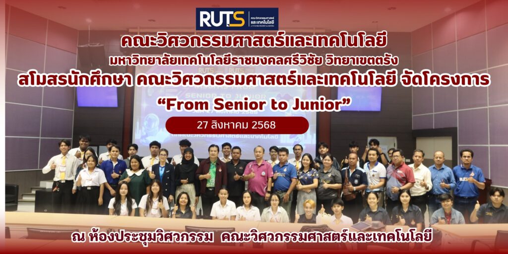 เมื่อวันที่ 27 สิงหาคม 2568 สโมสรนักศึกษา คณะวิศวกรรมศาสตร์และเทคโนโลยี มหาวิทยาลัยเทคโนโลยีราชมงคลศรีวิชัย วิทยาเขตตรัง จัดโครงการ “From Senior to Junior” โดยได้รับเกียรติจาก ผู้ช่วยศาสตราจารย์กิตติกร ขันแกล้ว คณบดีคณะวิศวกรรมศาสตร์และเทคโนโลยี เป็นประธานในพิธีเปิด พร้อมด้วย นายชัยวัฒน์ หอยสังข์ นักวิชาการคอมพิวเตอร์ แผนกวิทยบริการและเทคโนโลยีสารสนเทศ และทีมวิทยากร ซึ่งได้ร่วมบรรยายและจัดอบรม การพัฒนาทักษะการออกแบบสื่อออนไลน์ด้วย Canva ให้แก่นักศึกษา