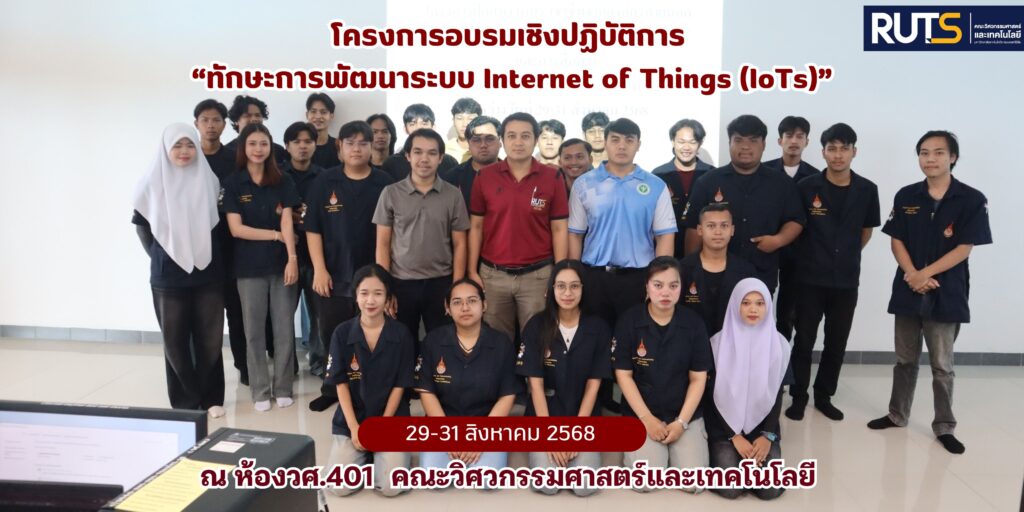 เมื่อวันที่ 29–31 สิงหาคม 2568 ที่ผ่านมา คณะวิศวกรรมศาสตร์และเทคโนโลยี มหาวิทยาลัยเทคโนโลยีราชมงคลศรีวิชัย วิทยาเขตตรัง ได้จัดโครงการอบรมเชิงปฏิบัติการภายใต้หัวข้อ “ทักษะการพัฒนาระบบ Internet of Things (IoTs)” ณ ห้อง วศ 401 อาคารเฉลิมพระเกียรติ 60 พรรษา เพื่อพัฒนาศักยภาพนักศึกษาในด้านเทคโนโลยีและนวัตกรรมดิจิทัล ตลอดจนเตรียมความพร้อมให้สามารถนำความรู้ไปประยุกต์ใช้ในสายวิชาชีพได้อย่างมีประสิทธิภาพ
