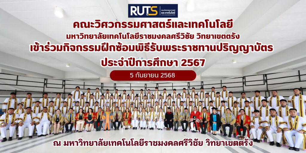 เมื่อวันที่ 5 กันยายน 2568 คณะวิศวกรรมศาสตร์และเทคโนโลยี มหาวิทยาลัยเทคโนโลยีราชมงคลศรีวิชัย วิทยาเขตตรัง นำโดยผู้ช่วยศาสตราจารย์กิตติกร ขันแกล้ว คณบดีคณะวิศวกรรมศาสตร์และเทคโนโลยี ผู้บริหาร อาจารย์ บุคลากร และนักศึกษา เข้าร่วมกิจกรรม ฝึกซ้อมพิธีรับพระราชทานปริญญาบัตร ประจำปีการศึกษา 2567 ซึ่งจัดขึ้นระหว่างวันที่ 4–5 กันยายน 2568