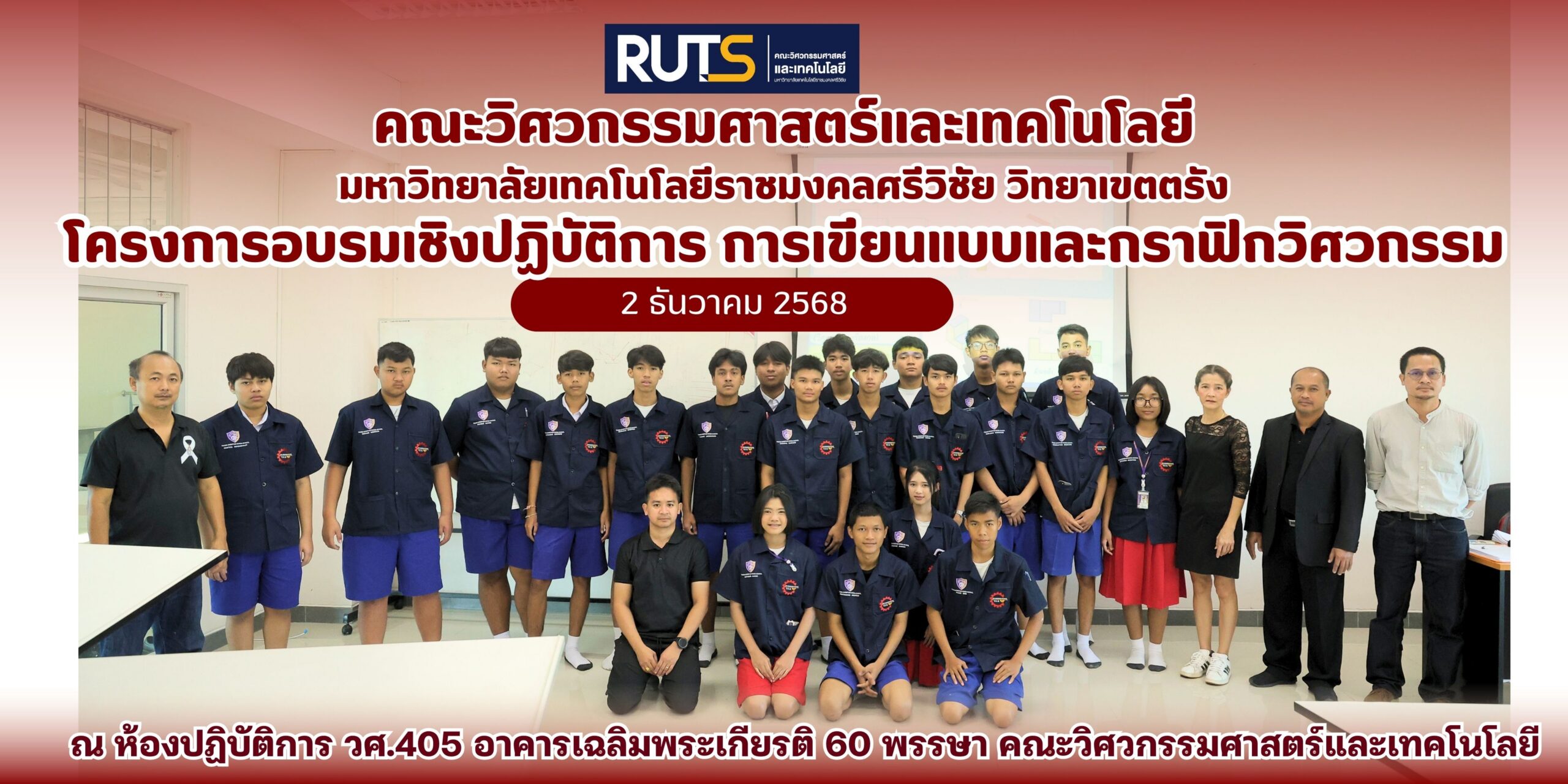 วันที่ 2 ธันวาคม 2568 คณะวิศวกรรมศาสตร์และเทคโนโลยี มหาวิทยาลัยเทคโนโลยีราชมงคลศรีวิชัย วิทยาเขตตรัง นำโดย ดร.ประสิทธิ์ ศรีนคร อาจารย์ประจำคณะวิศวกรรมศาสตร์และเทคโนโลยี จัดโครงการอบรมเชิงปฏิบัติการ “การเขียนแบบและกราฟิกวิศวกรรม” สำหรับนักเรียนระดับมัธยมศึกษาจากโรงเรียนตรังคริสเตียนศึกษา จังหวัดตรัง โครงการนี้จัดขึ้นภายใต้ บันทึกข้อตกลงความร่วมมือด้านการบริการวิชาการ ระหว่างมหาวิทยาลัยและโรงเรียนตรังคริสเตียนศึกษา โดยมีนักเรียนในแผนการเรียนเตรียมวิศวกรรมเข้าร่วม จำนวน 23 คน โดยได้รับเกียรติจากทีมวิทยากรผู้เชี่ยวชาญ ได้แก่ อาจารย์ขวัญชีวา หยงสตาร์ อาจารย์กิตติศักดิ์ ทวีสินโสภา และ ผศ.ดร.วีระศักดิ์ ไชยชาญ